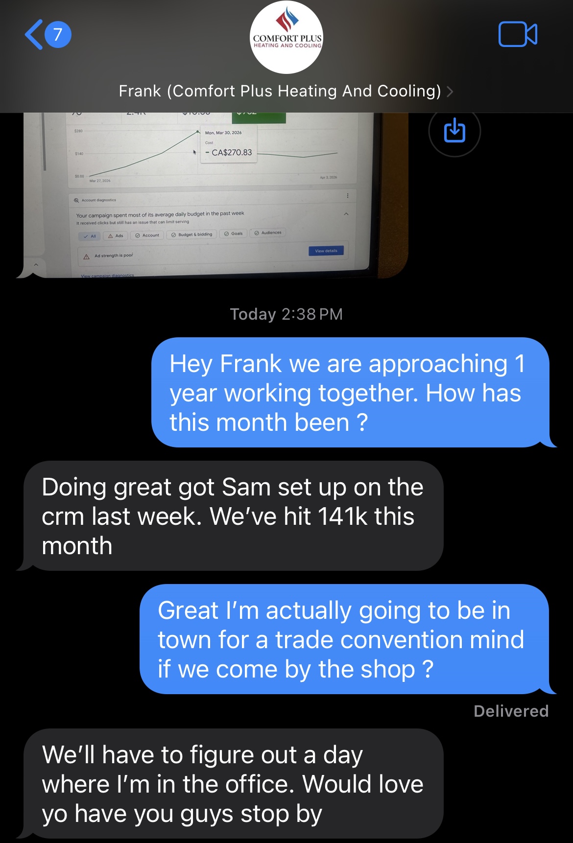 "Vandad and Lorenzo were professional, knowledgeable, and actually delivered. The system brought in quality jobs but what surprised me most was the follow-up automation β that was always our weak spot. We'd get leads and take an hour or more to respond and we were losing jobs because of it. That's fixed now. The referral automation was a bonus we didn't expect β we're getting new customers without spending more on ads."